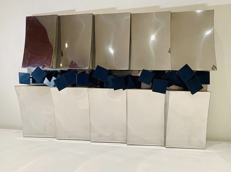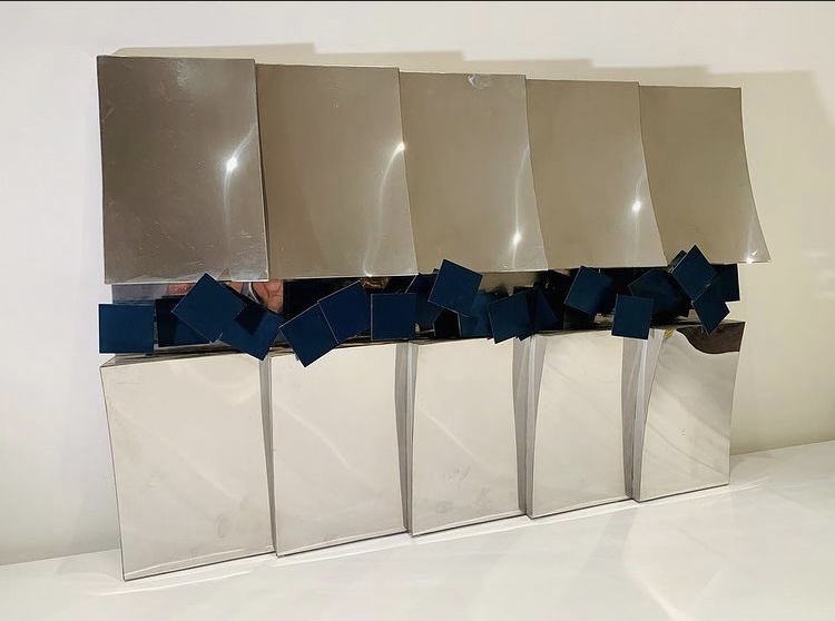 YUTAKA TOYOTA 1982 escultura de parede em madeira, aço polido e ferro pintado assinado, datado e localizado.