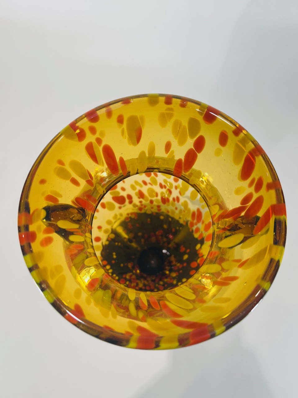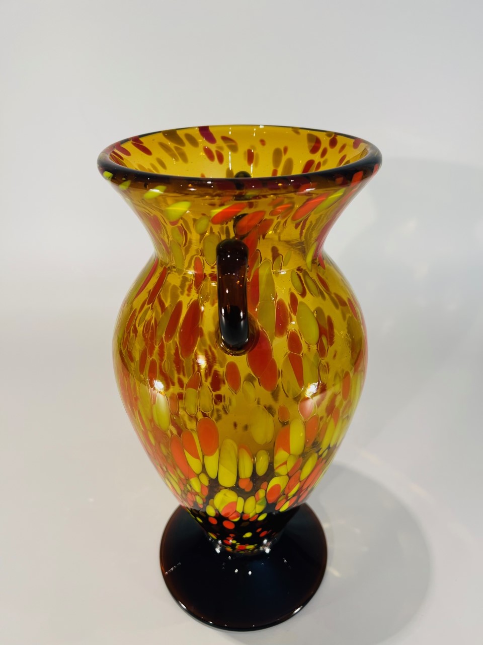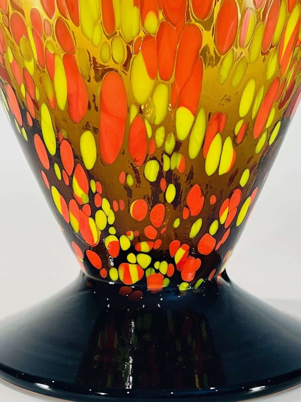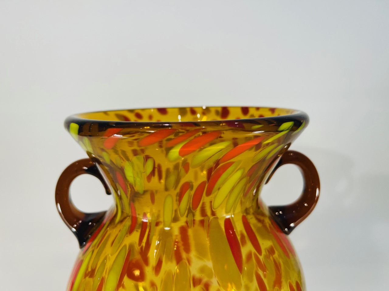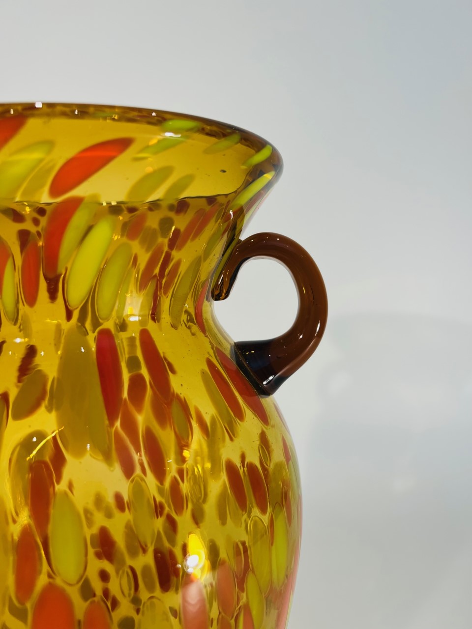 Vaso em vidro artístico soprado atribuído a ilha de Murano com aplicações laterais e pigmentação. Circa 1970.