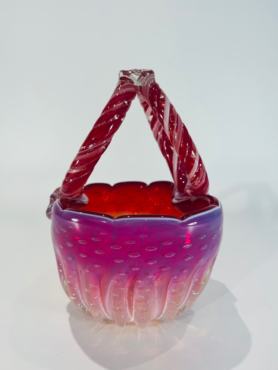 Cesta em vidro artístico soprado de Murano atribuído a CENEDESE com vidro aplicado e “bulicante”