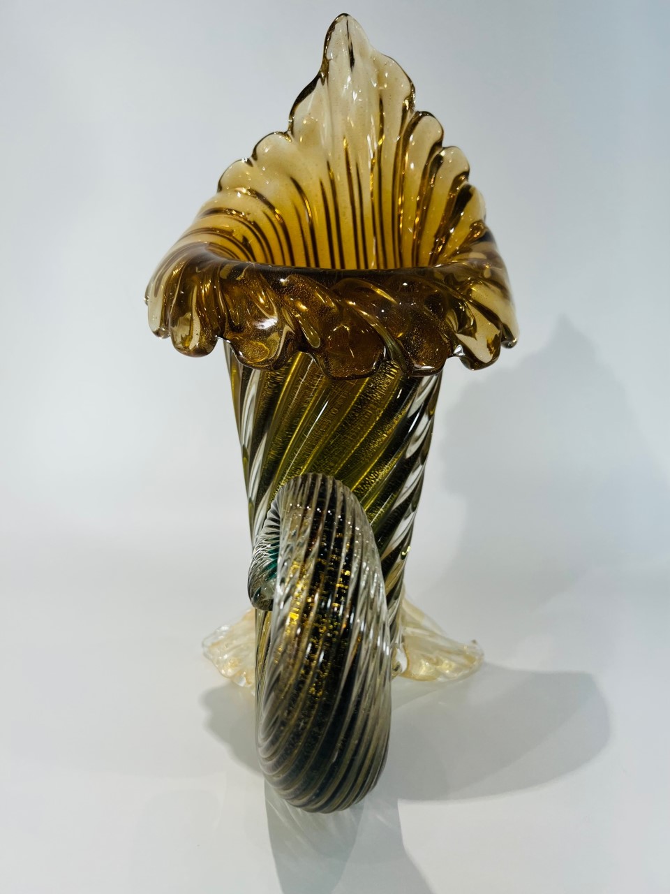 Cornucópia em vidro artístico soprado de Murano produção ARCHIMEDE SEGUSO 1950 “costolato retorto oro” com vidro aplicado.