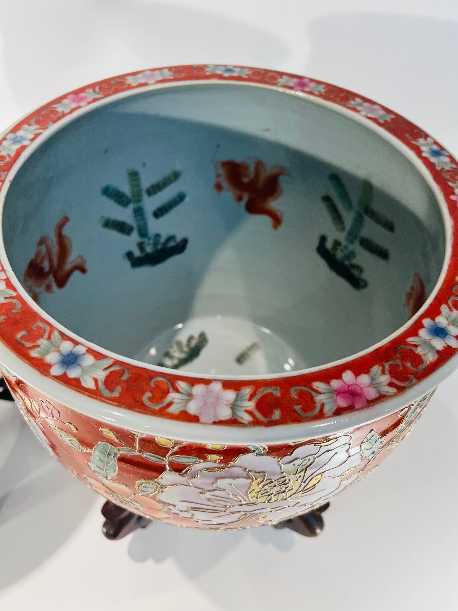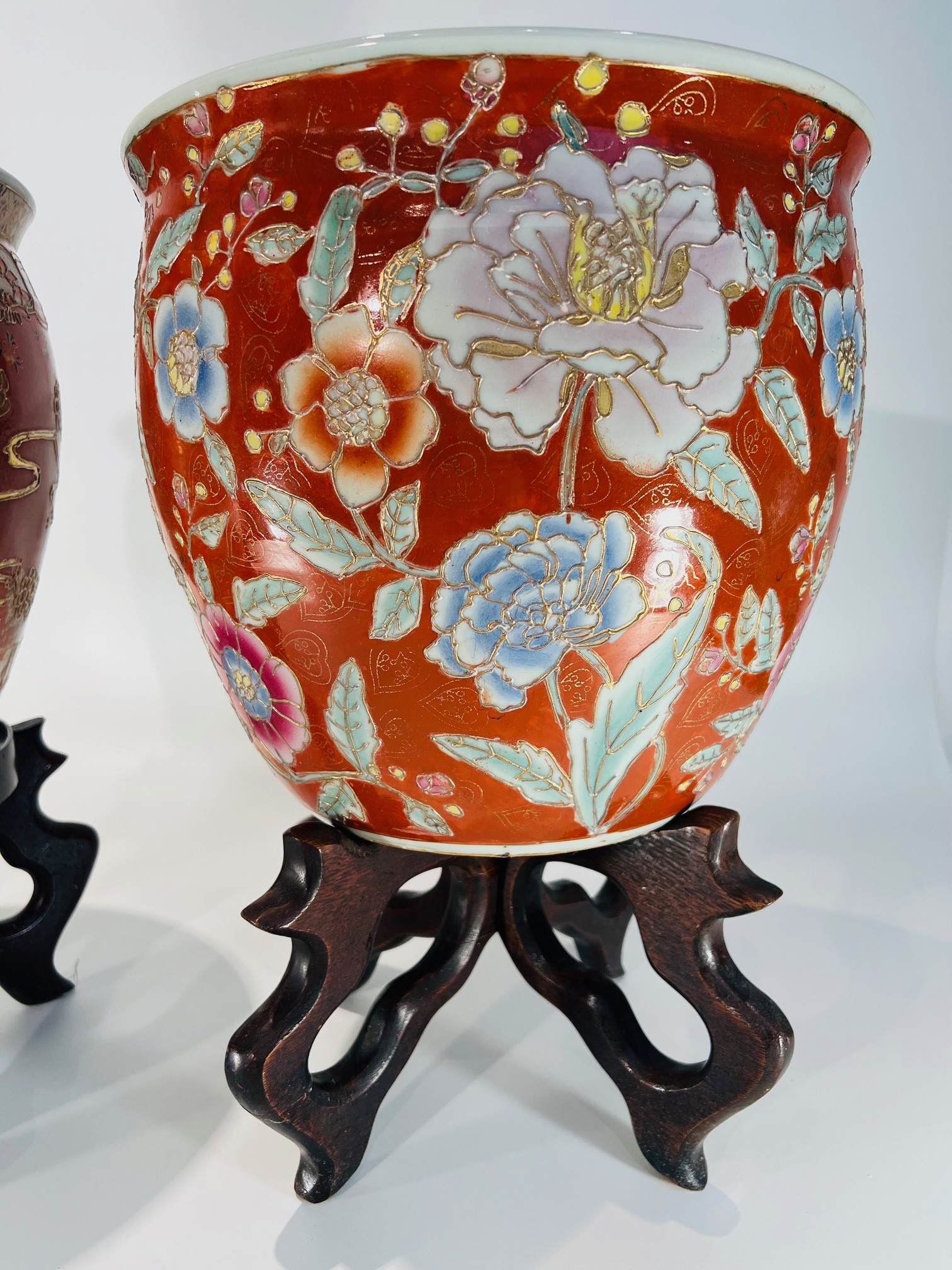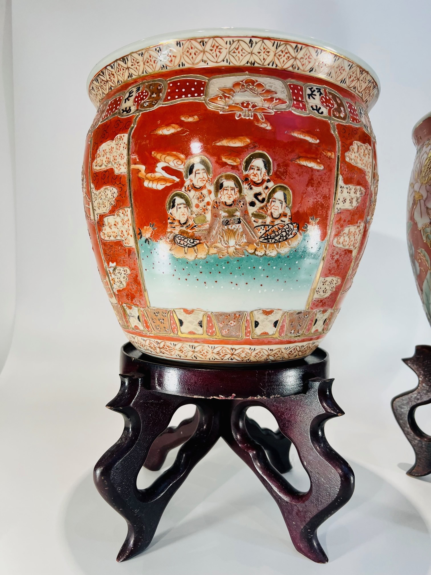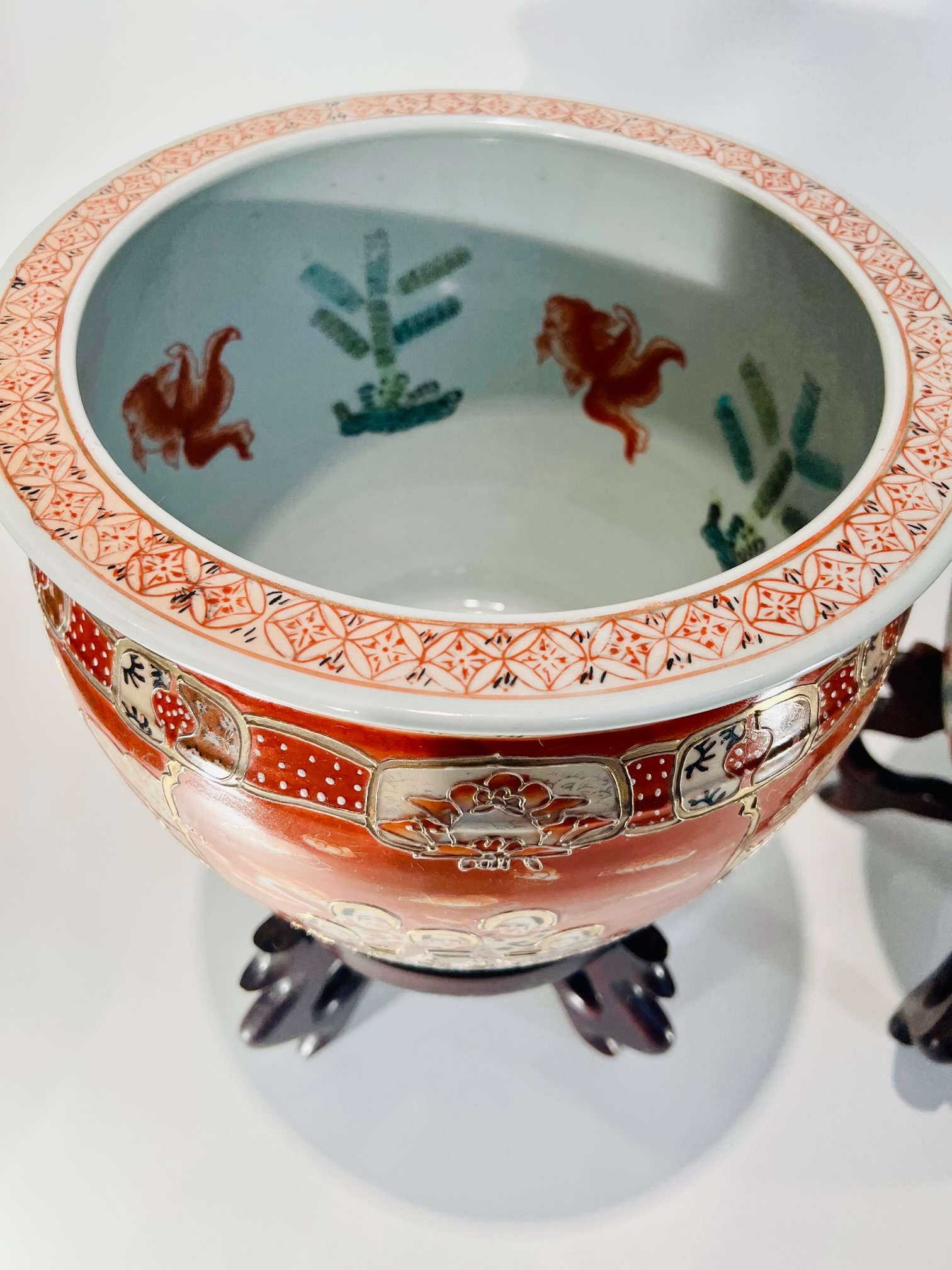 Dois (2) grandes aquários em porcelana japonesa Imari com filete de ouro e pinturas internas sobre base de madeira